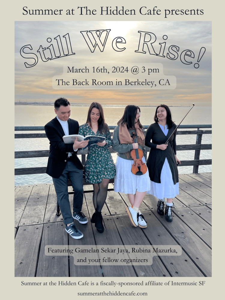 Season 3 Summer at The Hidden Cafe 2024 July 27th & 28th Main Event! Put It In Song! (A Side + B Side) May 25th & June 15th A Side B Side Still We Rise! March 16th Still We Rise!