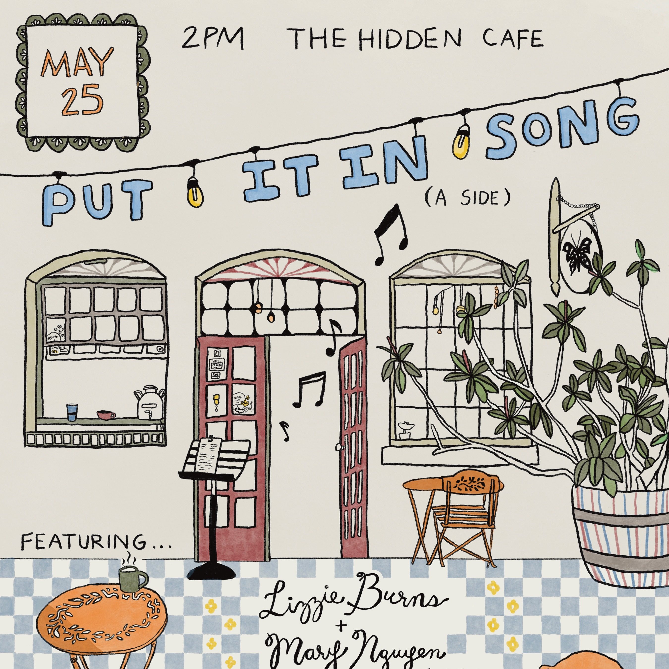 Join us on May 25th at 2 pm in front of The Hidden Cafe for our 2nd Preview Pop-Up Concert titled “Put It In Song! (A Side)” This event is the first of a 2-part concert featuring local songwriters and their songs, accompanied by a string quartet!
